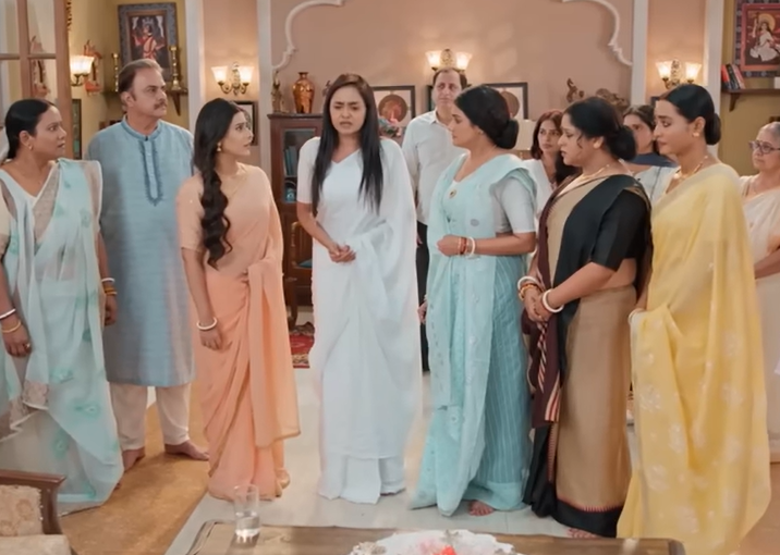 But still Pisimuni and her sister-in-law did not accept it happily. Pisimuni continued her harsh words towards Shakuntala and listed the hard traditions which she had to follow during these periods. After finishing her husband’s funeral she had to go back to her house, Ahana protested against it but Durga Devi supported Pisimuni’s decision and said she had to be back to her in-laws after the funeral was over.